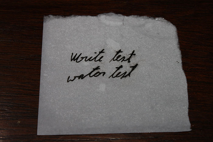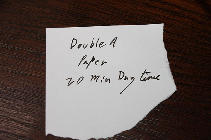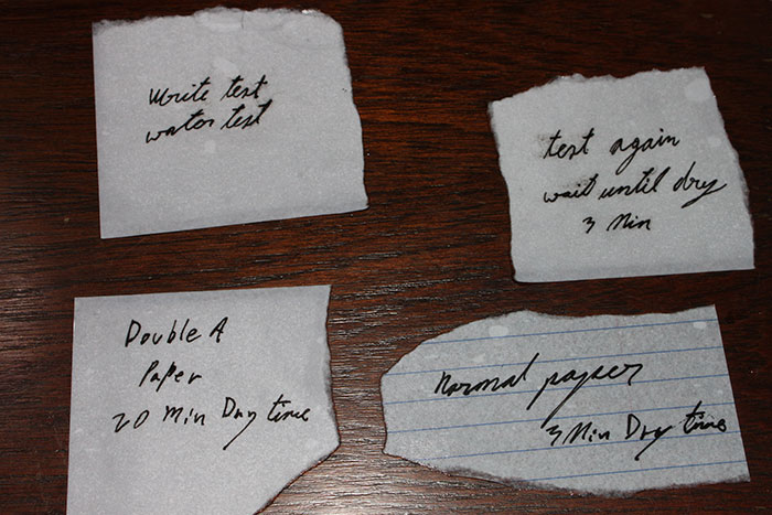 ใหนลองเปลี่ยนกระดาษสิ สงสัยว่า Double A กระดาษแน่นหมึกเลยจับตัวกับกระดาษช้า เลยเอากระดาษสมุดธรรมดามาเขียนครับ เพราะ เคยใช้กระดาษสมุดนี่แหละเขียนรอแห้งประมาณ 2 นาทีแล้วจุ่มน้ำได้เลยนี่นา ไม่น่าพลาด