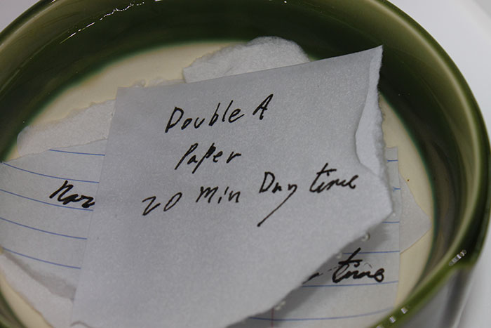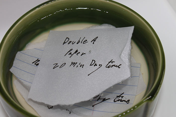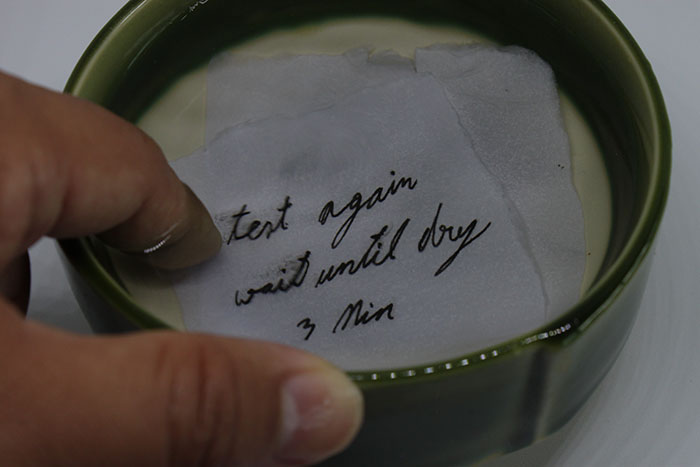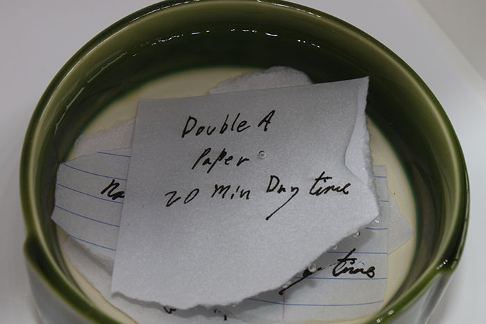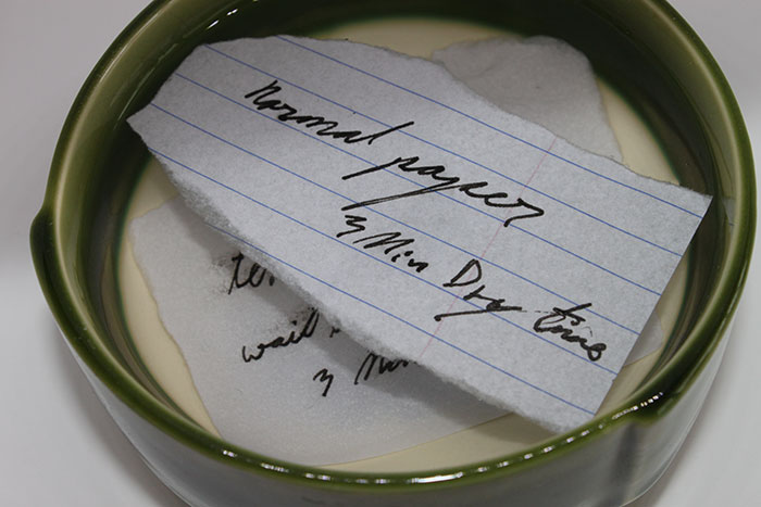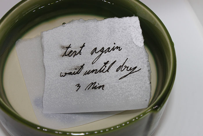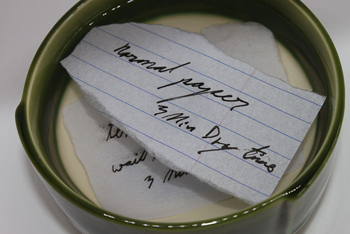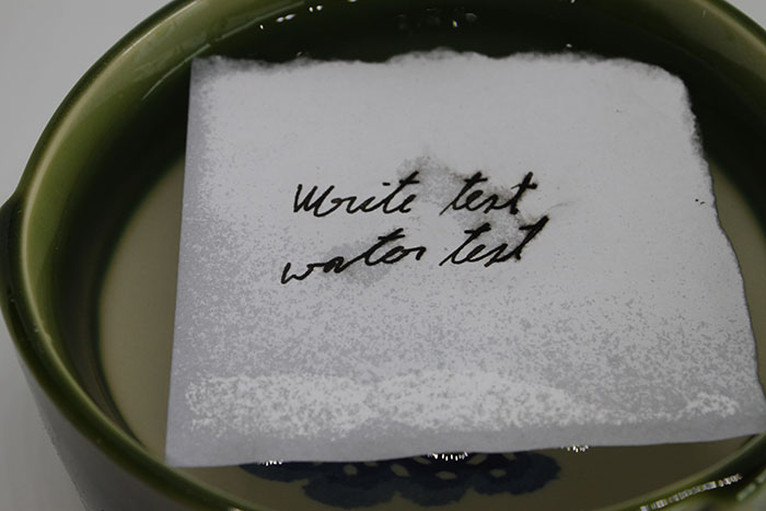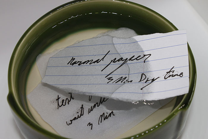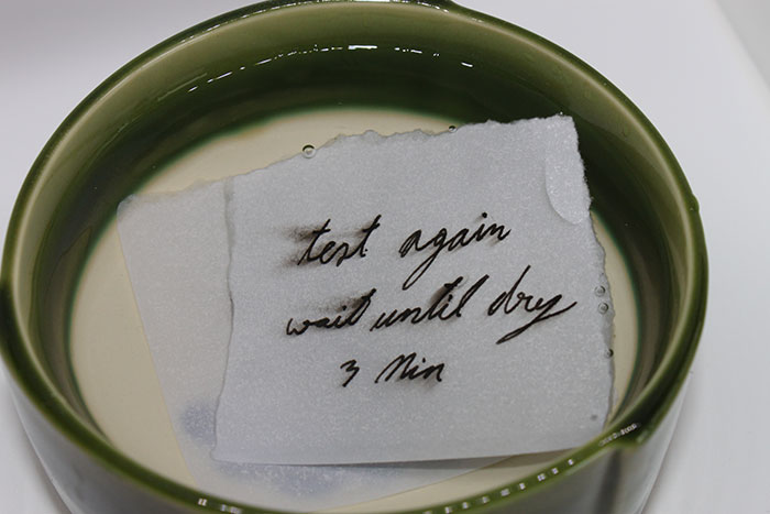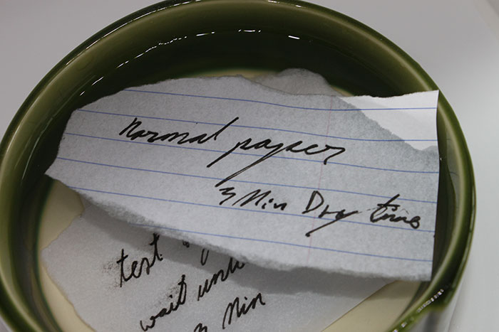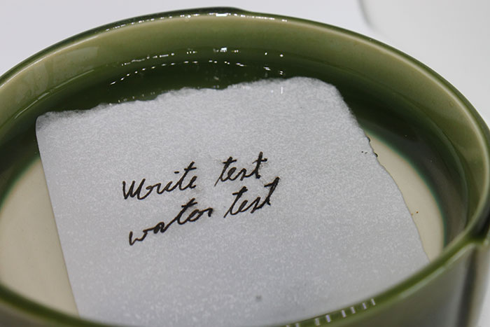 รอจนผ่านไป 5 นาทีครับ สบายๆ แระ กระดาษบางแห้งไว หมึกซึมจับตัวกับเนื้อกระดาษได้ดีครับ แช่น้ำไป 5 นาที สบายๆ