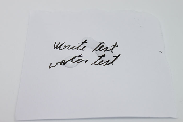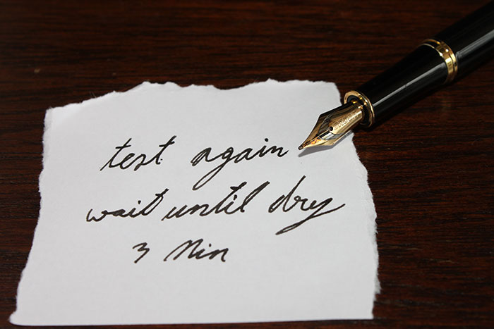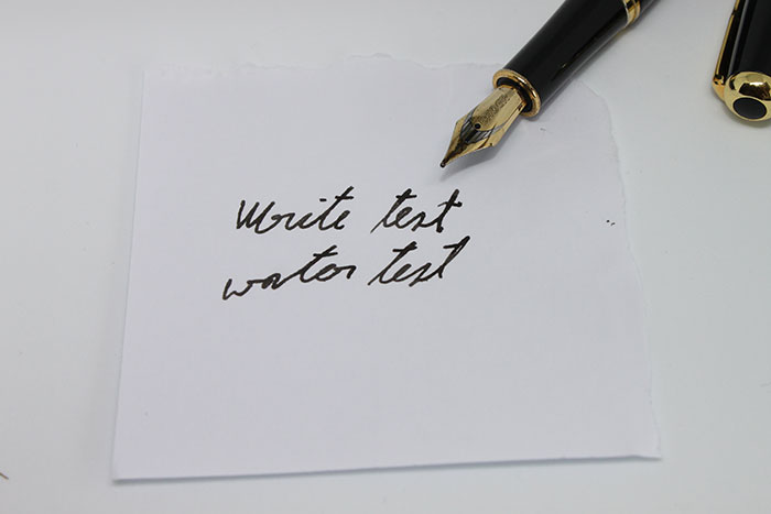 ปัญหานึงที่คนกลัวการใช้ปากกาหมึกซึมก็คือกลัวการโดนน้ำของสิ่งที่เราเขียนน่ะครับ กลัวมันจะละลายหายไปกับสายน้ำน่ะ แต่ เรื่องนี้ไม่ต้องกังวลเสมอไปนะครับเพราะ หมึกกันน้ำสามารถแก้ปัญหานี้ได้ สำหรับปากกาหมึกซึม แนะนำตัวนี้ครับ Baoke MS 217 ซึ่งเป็นหมึก Carbonize สำหรับปากกาหมึกซึมโดยเฉพาะ ลองดูการทดสอบนะครับ ;)