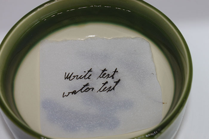 พอเขียนเสร็จก็ปล่อยให้แห้งสัก 3 นาทีครับ แล้วก็เอาน้ำมาหยดใส่ “ ตั้งใจให้เปียกอย่างเดียวเลยครับ ลืมไปเลยว่า ให้สังเกตสีของเส้นจากการเขียนนะครับ ดำสนิท แห้งแล้วก็ไม่ซีดจาง ลงเลยเข้มคมมาก “